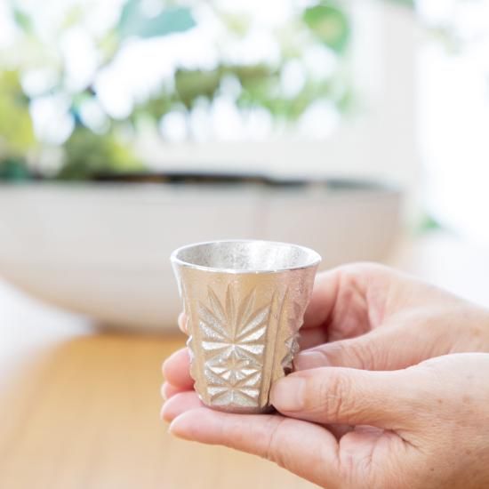 錫器の程よい重みと質感が手になじむぐい呑。薩摩切子をイメージして施しました。