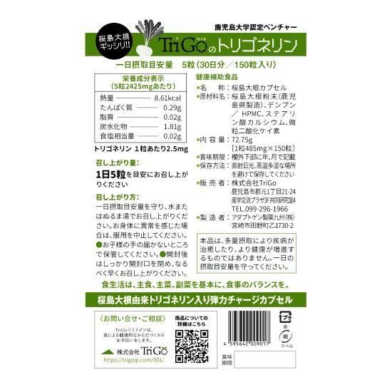 桜島大根粉末(鹿児島県製造)、デンプン/HPMC、ステアリン酸カルシウム、微粒二酸化ケイ素